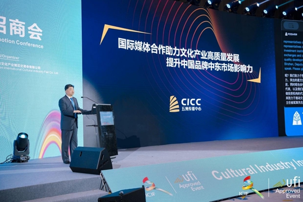 5月25日上午,五洲传播中心党委副书记崔斌箴在文化产业招商大会上就“国际媒体合作助力文化产业高质量发展——提升中国品牌中东市场影响力”主题进行分享交流,倡导中国文化机构利用国际媒体资源营销中东文化贸易市场,推动文化产业高质量发展,具有重要的理论价值和现实意义。