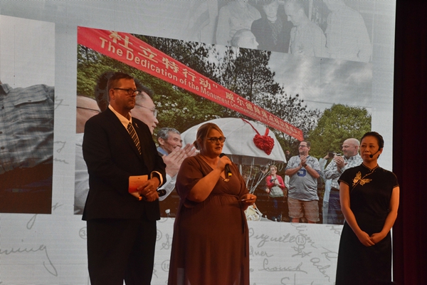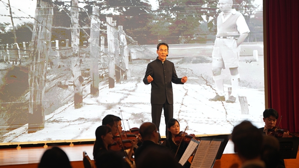 故事会随着宁波交响乐团奏响《黄河大合唱》选段“黄河怨”,悲壮激昂的旋律瞬间将观众带回中国军民顽强抗敌的岁月,活动正式拉开帷幕。整场故事会以“影像—高墙—家园—铁翼—爱无疆界”为叙事脉络,通过“历史场景重现+亲历者后裔讲述+珍贵信物展示”的立体呈现方式,让五段跨越时空的友谊故事在交响音乐的烘托下更具感染力。来自侵华日军南京大屠杀遇难同胞纪念馆的展陈专家,与南京大屠杀唯一的动态影像记录者之孙携手登台,以“两代人的镜头对话”呈现镜头里的正义与和平。潍县集中营的“黑暗互助”故事展现集中营里的人性光辉。衢州杜立特行动纪念馆讲述者,以一枚“1937年一美分硬币”为线索,还原1942年惊心动魄的生死营救故事。来自桂林的讲述者以一架飞虎队C-47运输机跨越万里的“使命之旅”展现了中美军民并肩作战的故事。最后,来自飞虎队医院的两位中外后裔共同带来“驼峰航线”上的医疗互助故事,共同用90年前的乐器拨动《友谊地久天长》旋律,成为中美战地情谊的生动注脚。