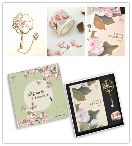 同时,我们还推出了一款三八节早春礼盒,一本手账+一支团扇形梅花书签+一个玉兰花和纸胶带。故园海棠花开,邀君花下小酌。