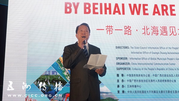 北海市委宣传部副部长、市委网信办主任陈鸿立在开幕式中向参会嘉宾和媒体详细介绍了北海特色旅游资源。