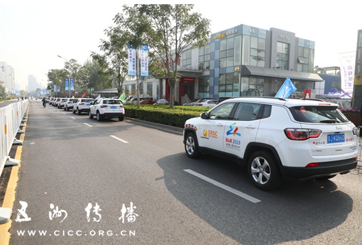 随后,在场嘉宾为10位车队代表授旗。挥舞着队旗的“2019丝绸之路万里行”代表团成员们登车,10辆SUV采访车和1辆卫星转播车从玲珑塔下缓缓驶出,中国媒体团以及中国品牌代表从北京启程,他们将作为丝路使者,带着真诚交流与和平发展的美好愿望踏上万里丝路。