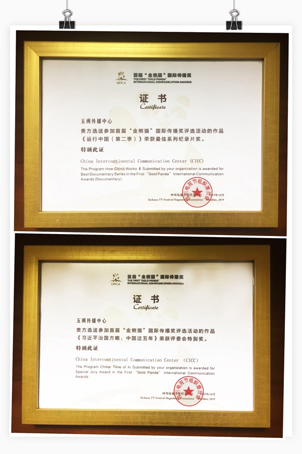 今年首次亮相的“金熊猫”国际传播奖和四川电视节同步举办,在电视节历史上具有里程碑意义。“金熊猫”国际传播奖以“中国故事•国际传播”为主旨,特别设置了评委会特别奖,旨在鼓励推动构建人类命运共同体、加强建设国际传播力上做出突出贡献的作品。首次评委会特别奖颁给了由五洲传播中心与探索频道、英国子午线影视公司共同合作的纪录片《习近平治国方略》,成为颁奖典礼的一大亮点。同时,由五洲传播中心、Discovery探索频道和IFA制作公司联合制作的纪录片《运行中国(第二季)》荣获“金熊猫”国际传播奖最佳系列纪录片奖。