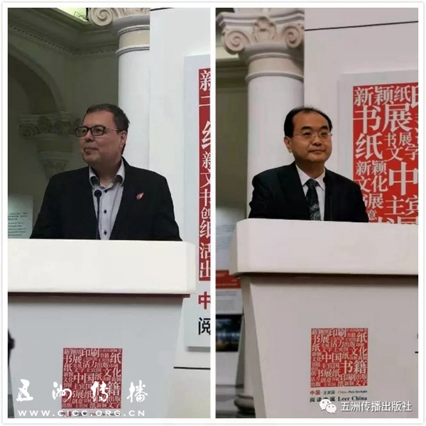 委内瑞拉文化部副部长兼国家图书中心主席卡萨尔致辞(左)中国出版集团总经理黄志坚先生致辞(右)