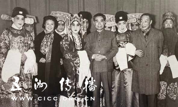 1963 年,北京京剧团赴港演出前,周恩来总理观看《奇双全》后与张君秋等合影