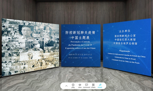 9月27日,“防控新冠肺炎疫情——中国主题展”云展厅上线。在入口处,中国驻巴西大使杨万明用葡语致欢迎辞。他说,新冠肺炎疫情是包括中巴两国在内的世界各国面临的共同挑战,希望通过此次展览展示中国的具体行动和支持巴西及世界各国抗击疫情、构建人类卫生健康共同体的坚定决心。杨万明表示,中国将继续支持巴西和巴西人民尽早战胜疫情。