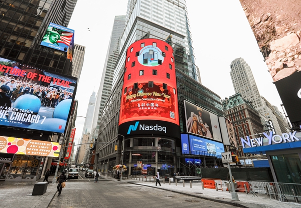 2月12日大年初一,伴随着美国纳斯达克交易所开市钟声,由五洲传播出版社创作的“多彩中国年”短片正式登陆纽约时报广场大屏,以“福牛”形象传播春节文化,向全美送去新春祝福。五洲社设计创作的中国春节系列作品,自2015年起已连续6年入选我驻纽约总领馆举办的纳斯达克中国新年敲钟仪式。