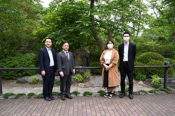 记者(左二、右二)与梶浦伸作副部长(左一)、吴启伸先生(右一)在“周樱”留影