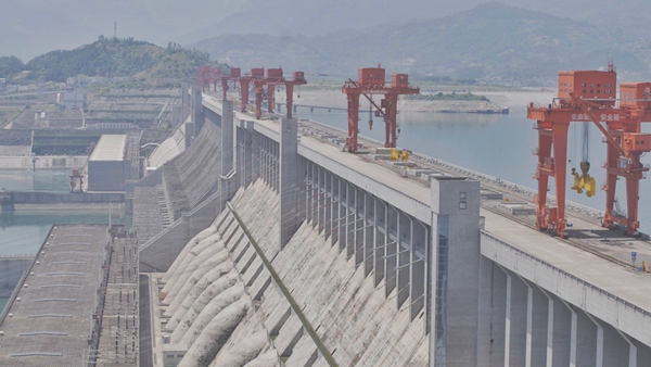 图为三峡大坝坛子岭上,胡胜丰给占苏丽讲解电站运行原理