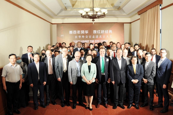 6月22日,由外交部和国务院新闻办公室主办,北京人民艺术剧院提供支持,五洲传播中心承办的“看百年风华 观红色经典——驻华外交官走进北京人艺”活动在京圆满举行。外交部礼宾司司长洪磊、国务院新闻办公室对外推广局局长吴旭、北京市委宣传部副部长徐和建、北京人民艺术剧院院长任鸣出席本次活动。活动邀请了来自俄罗斯、澳大利亚、德国、意大利、阿尔巴尼亚、波黑、沙特阿拉伯、阿根廷、乌拉圭、新加坡、斯里兰卡、赞比亚、欧盟等五大洲55个国家驻华使馆(国际组织驻华使团)的114位驻华大使和外交官参加。通过“了解党史+体验文化”形式,向驻华外交官讲述中国共产党的故事,促进其更好了解中国共产党历史。