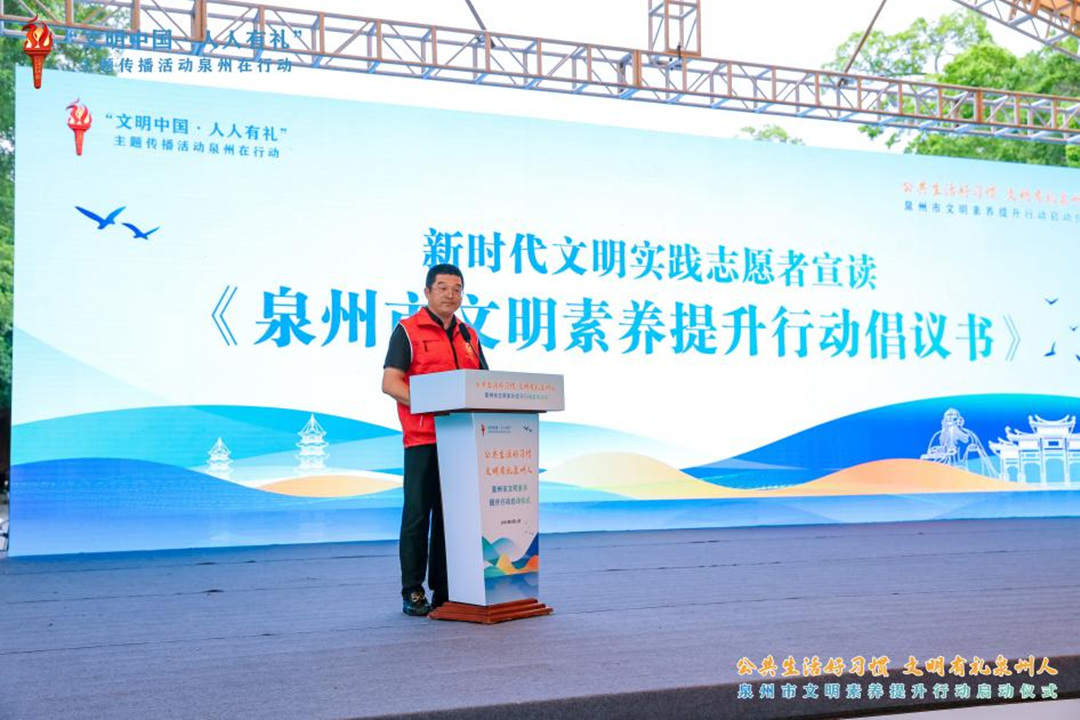 活动伊始,新时代文明实践志愿者上台宣读《泉州市文明素养提升行动倡议书》,以声音传递文明,用行动开启征程。