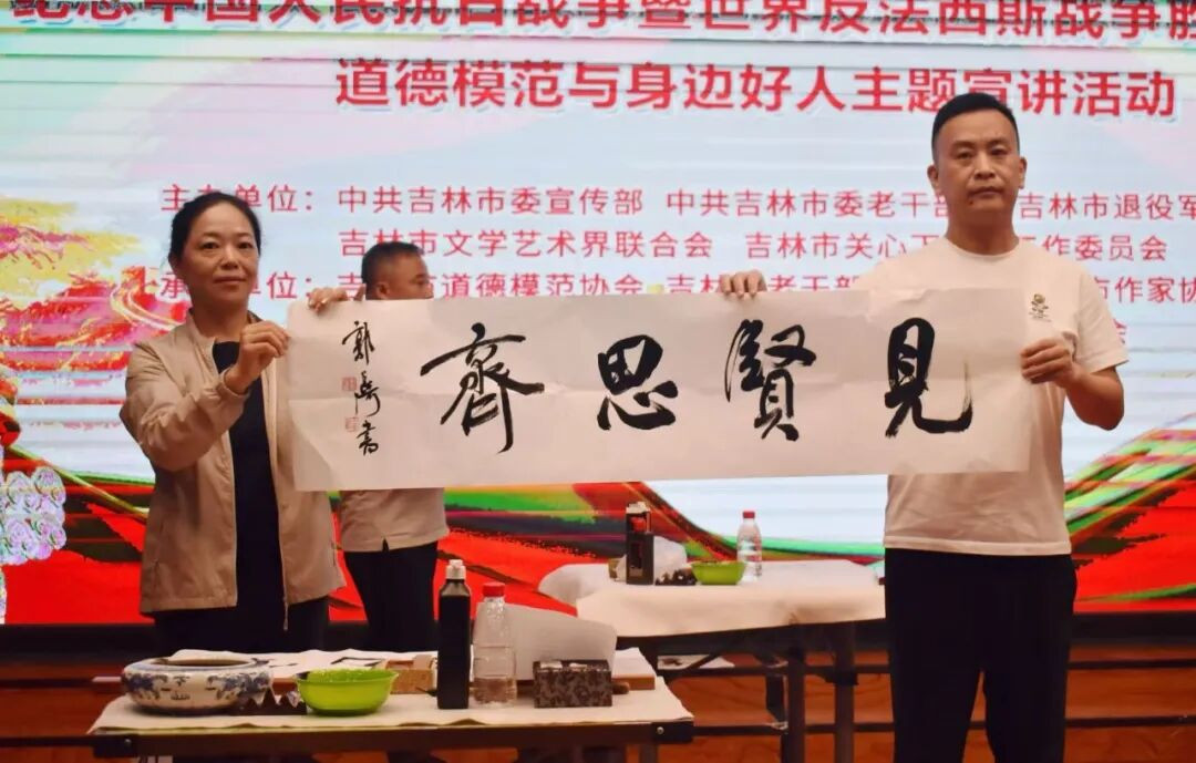 为进一步深化活动内涵,本次活动特别设置红色文化馈赠环节,将文化传承与文明传播有机结合。活动现场,书法家挥毫泼墨,以践行“文明有礼”文明家风为主题创作书法作品,传递着对文明新风的倡导与期许。这些作品随后被赠予本次宣讲活动的嘉宾,既是对宣讲者传播红色精神的致敬,也是对“文明有礼”理念的生动诠释。