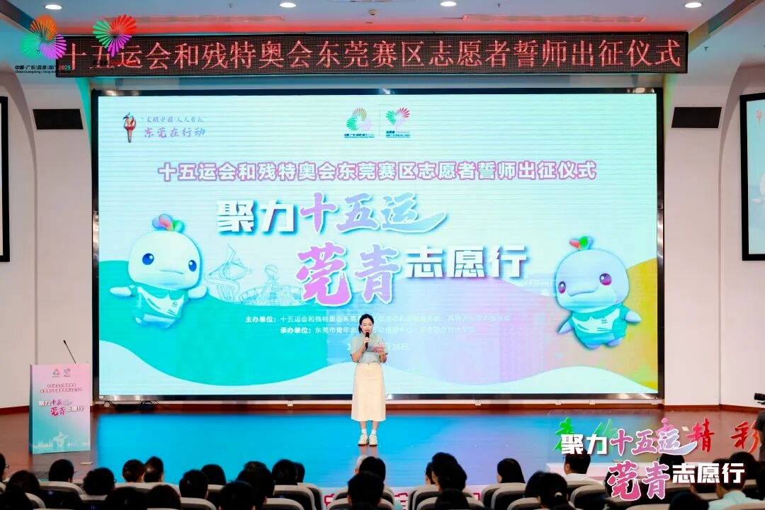 近日,十五运会和残特奥会东莞赛区志愿者誓师出征仪式在广东省东莞职业技术学院举行。活动现场,志愿者代表集体誓师,将以最饱满的热情和最专业的服务,投身于篮球、举重赛事的志愿服务保障。仪式开始,十五运会歌与志愿者主题曲及MV奏响,激昂旋律点燃全场。