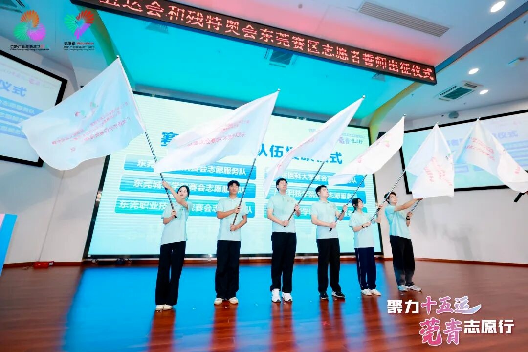 活动现场,十五运会和残特奥会东莞赛区赛会志愿服务队、城市志愿服务队获授旗。350名志愿者代表庄严宣誓:“我志愿服务十五运会和残特奥会,听从指挥、团结协作,微笑服务、不辱使命,践行志愿精神,弘扬先进文化,为湾区添彩,为祖国争光!为你,更精彩!”