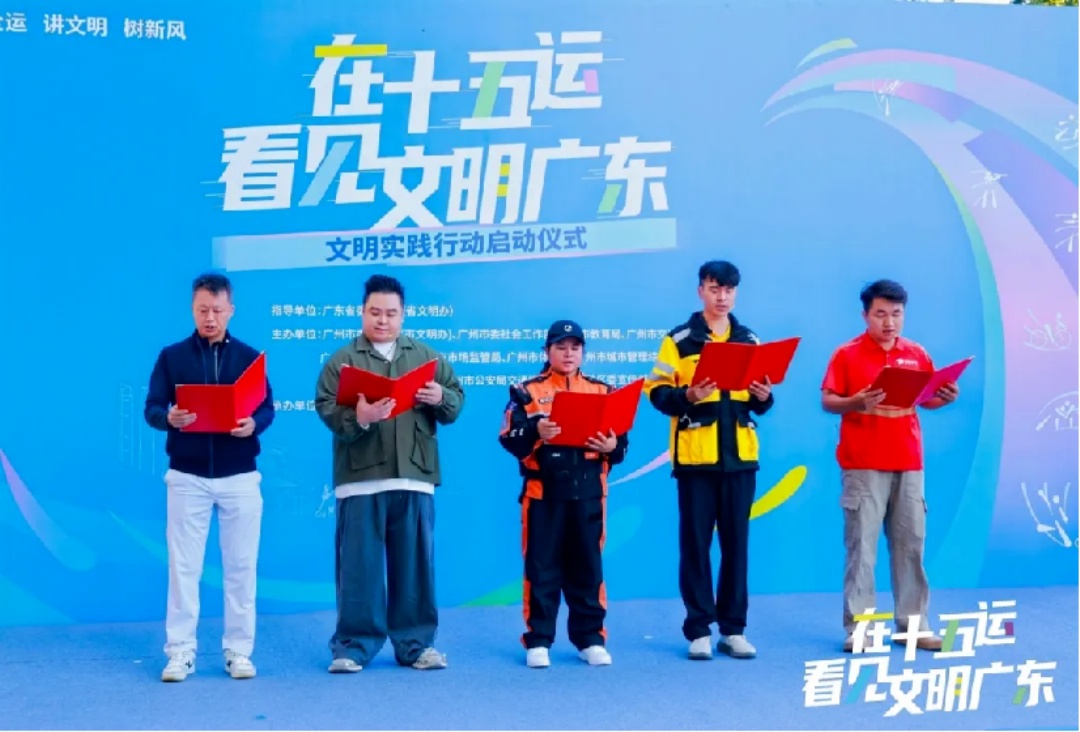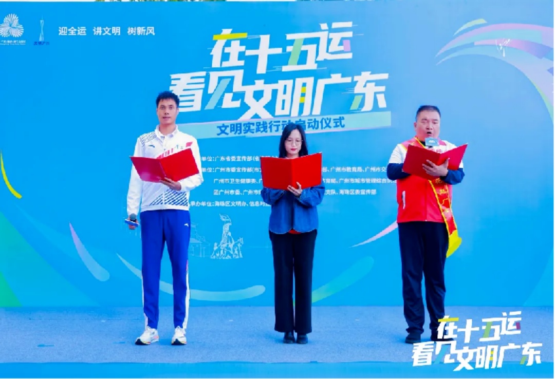 广东籍短跑名将莫有雪、全国人大代表沈燕芬与“广州好人”代表共同发起《迎接十五运 共筑健康城》爱国卫生倡议,号召市民积极参与环境卫生整治,共同营造洁净优美的城市环境。行业代表共同宣读《文明骑行 从我做起》倡议,承诺自觉带头做到文明骑行,以身作则带动广大市民共同维护安全、畅通、有序的出行环境。