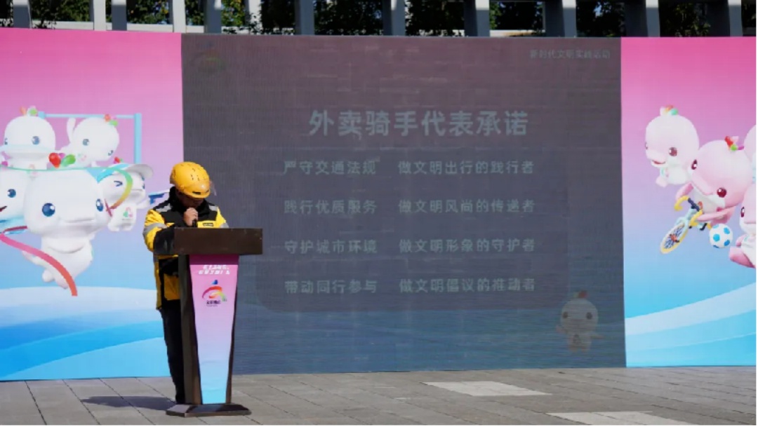 “我承诺:严守交通法规,做文明出行的践行者。践行优质服务,做文明风尚的传递者!”——外卖骑手代表铿锵有力的承诺,赢得阵阵掌声,展现城市服务行业的文明新风。