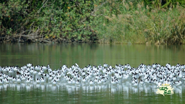 在改造后的基围鱼塘休息的反嘴鹬